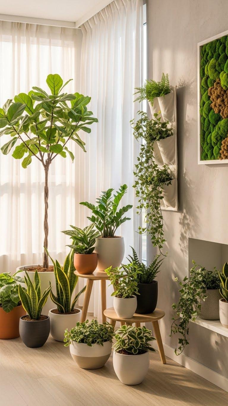 Mix vertical gardens and moss frames to add texture and freedom of placement, creating serene green vignettes that feel intentional, airy, and truly yours.