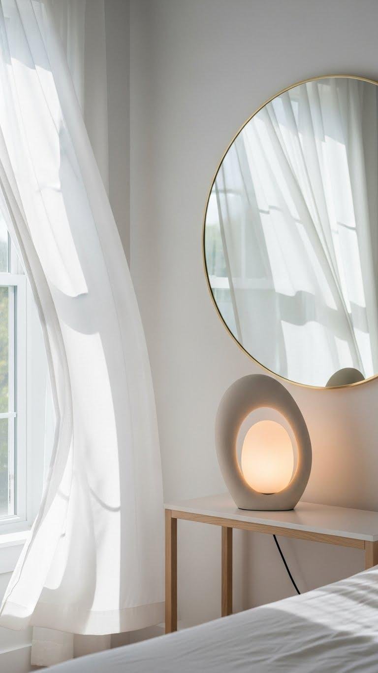 With curtains softening the backdrop, round mirrors and curved lamps keep the room feeling gentle and composed.