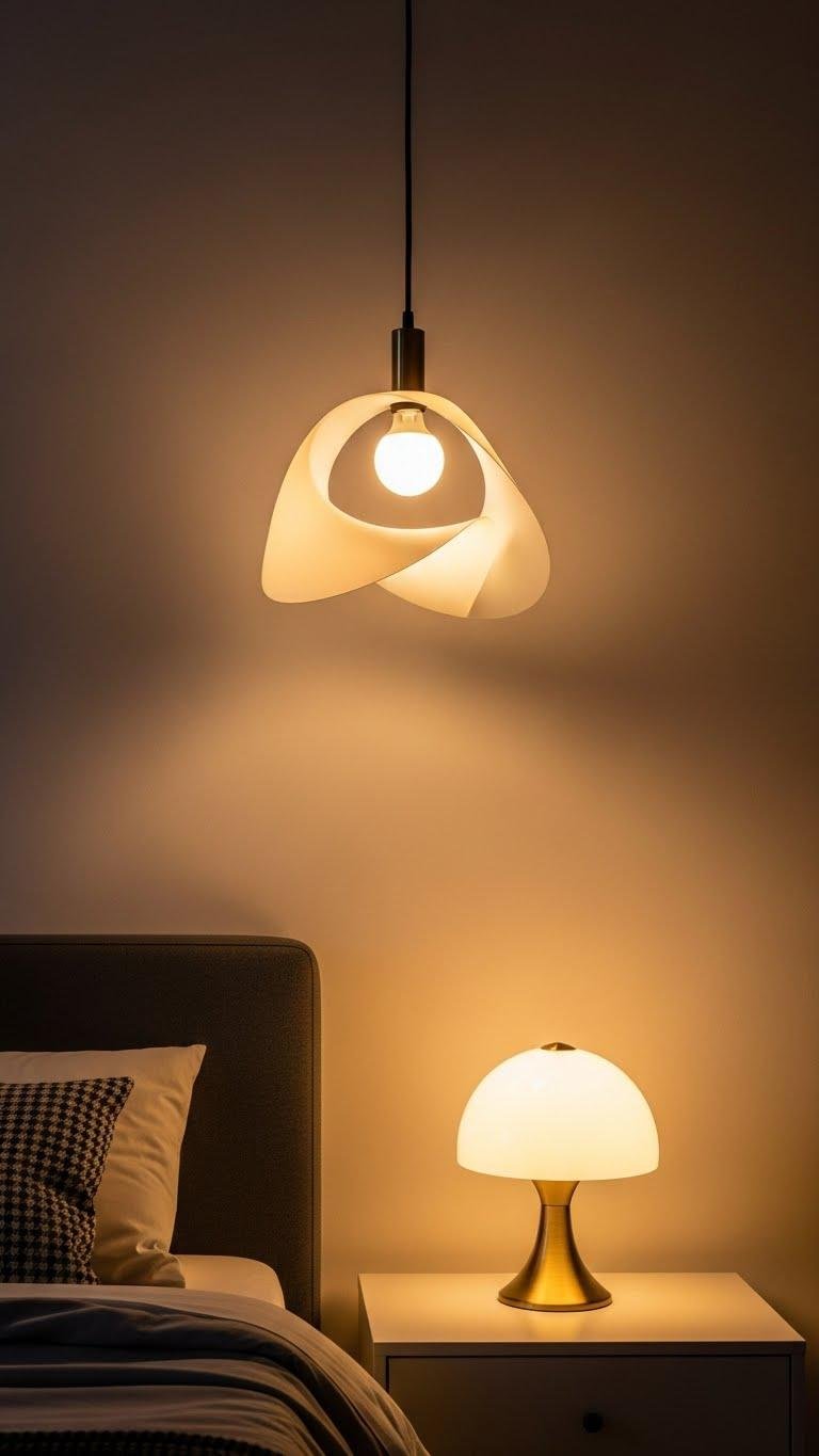 Hang a sculptural pendant over the bedside and pair it with a low, warm-glow table lamp to create layered, controllable light that feels deliberate and calming.