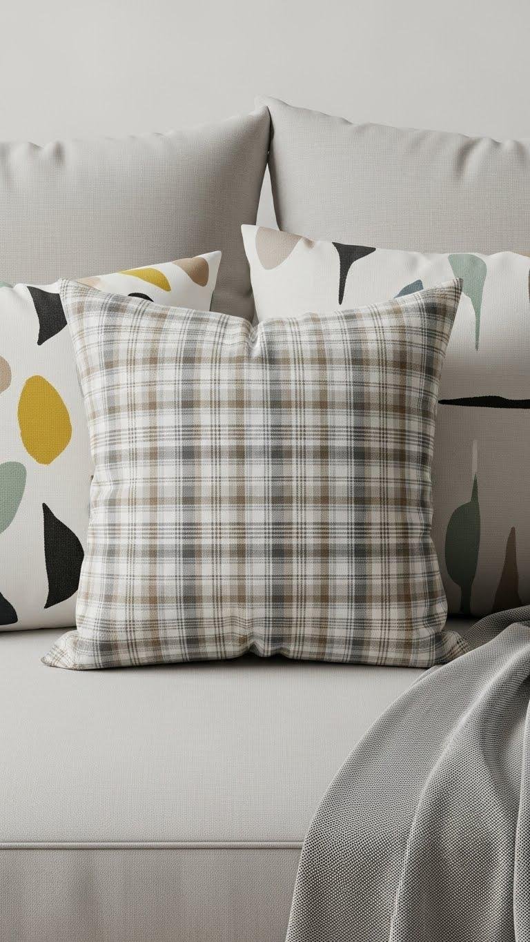 Often, you’ll let a single plaid pillow anchor a cluster of solid cushions so the pattern reads intentional, not cluttered.