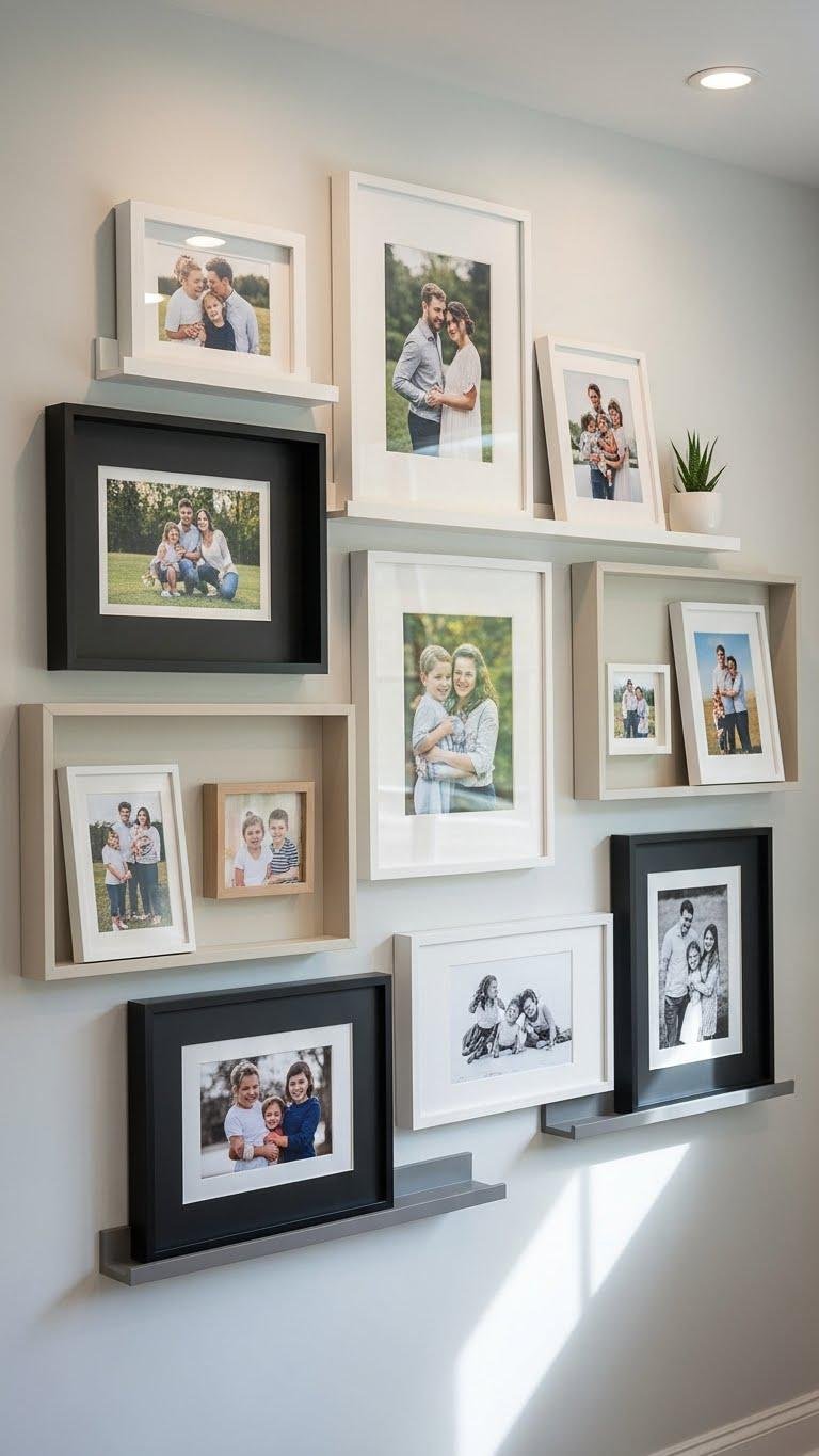 When you build photos into shelves or niche cubbies, they read like deliberate décor instead of cluttered snapshots, giving each frame room to breathe. Use shallow gallery ledges and mixed shadowboxes display to craft a calm, curated wall.