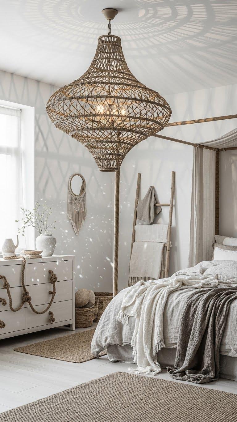 A woven chandelier or a simple rope accent can instantly soften a light bedroom’s look while keeping the palette airy and restrained. You’ll choose woven pendants with open weaves to cast gentle shadows and keep sightlines free.