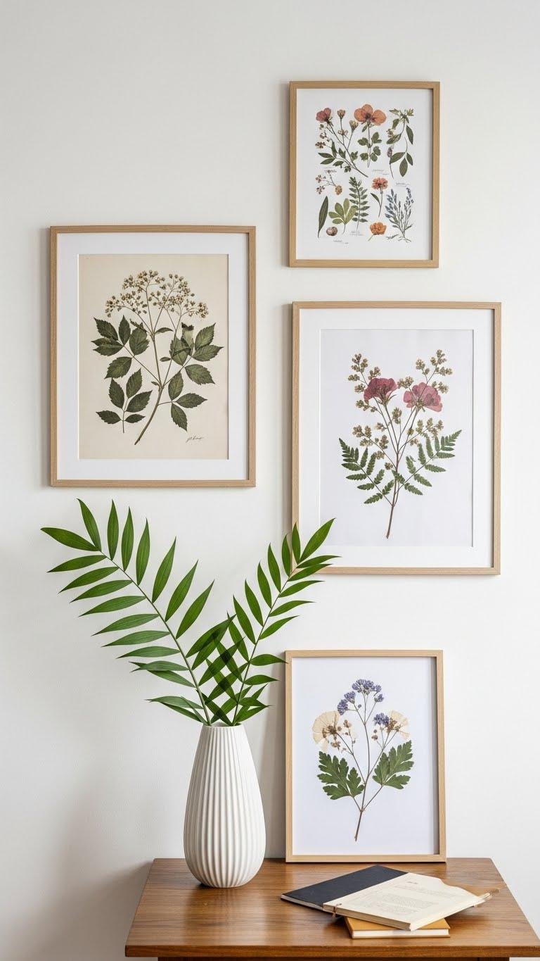 Pressed florals in a slim frame add delicate texture without clutter.