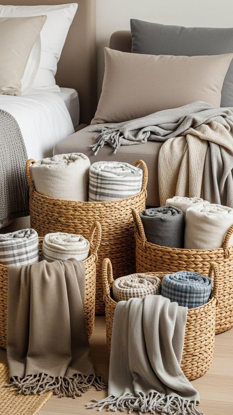 Lean into simple storage styling: mix sizes, tuck ends in, leave one blanket casually draped. It feels lived-in, calm, and free.