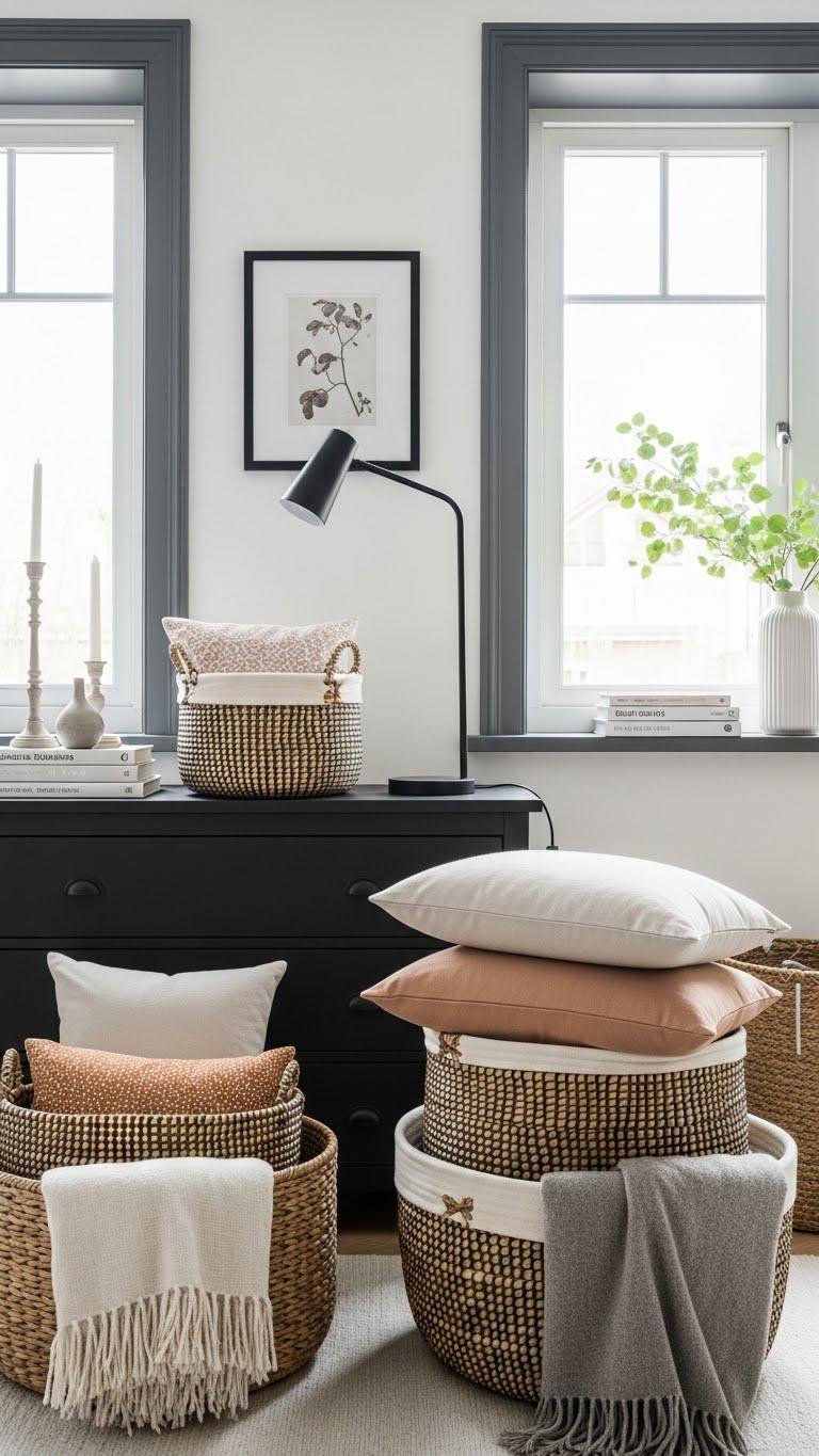 Place Baskets of Extra Pillows and Throws for Texture