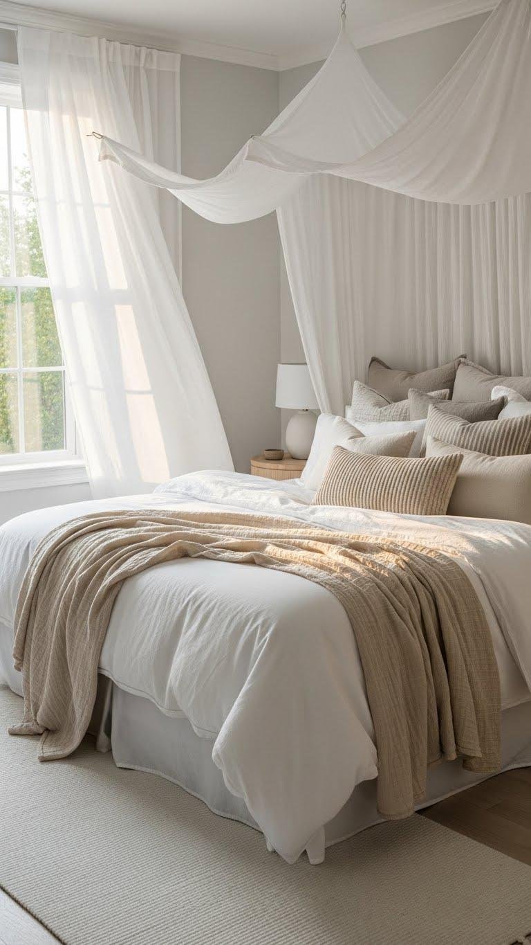 Let the soft canopy meet a bed dressed in crisp cotton sheets—cool, breathable, and visually clean—to balance the room’s airiness. You’ll layer monochrome bedding for a calm foundation, then add piles of cushions in varied textures and sizes.
