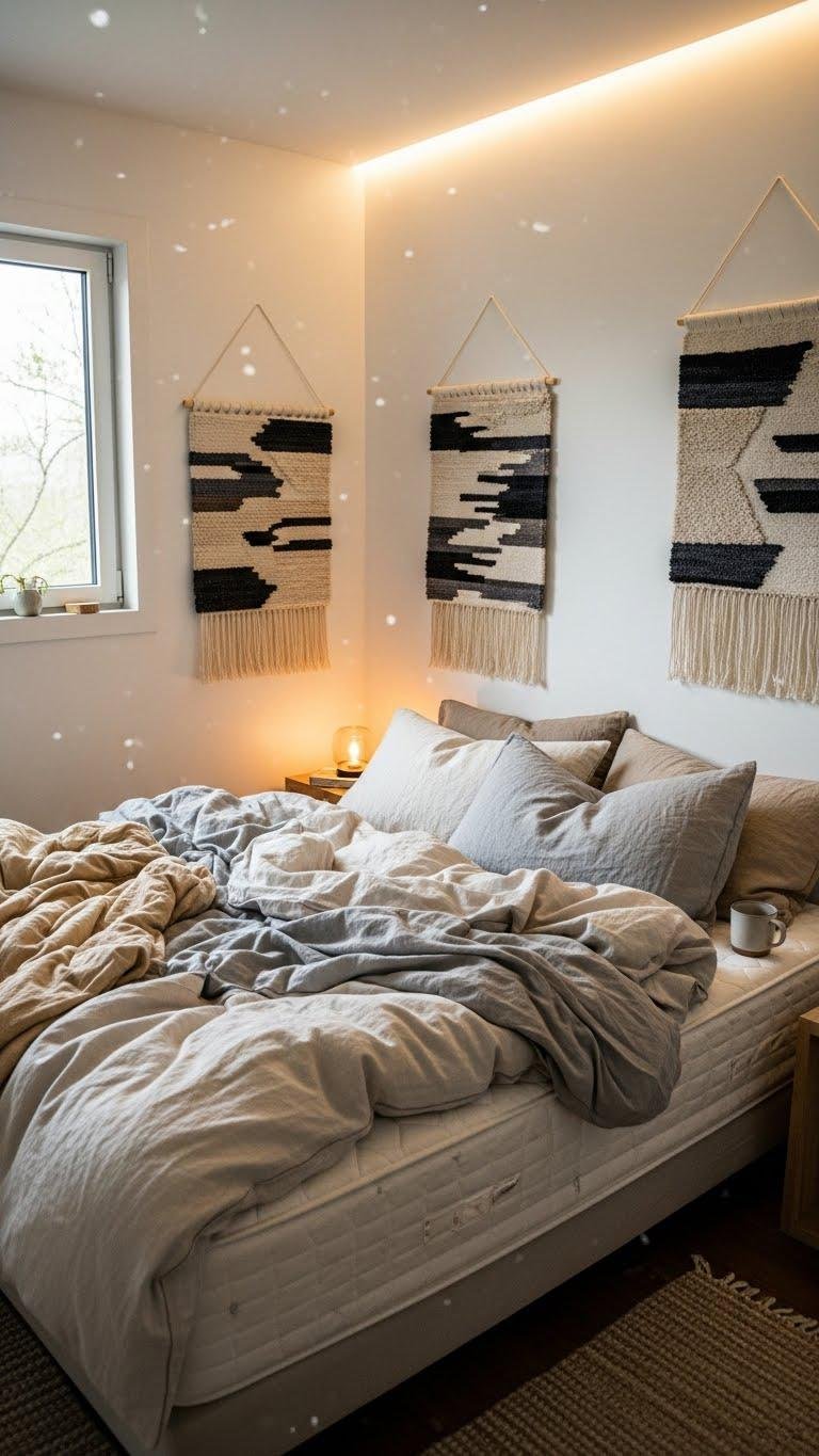 Incorporate Linen Bedding and Woven Wall Hangings