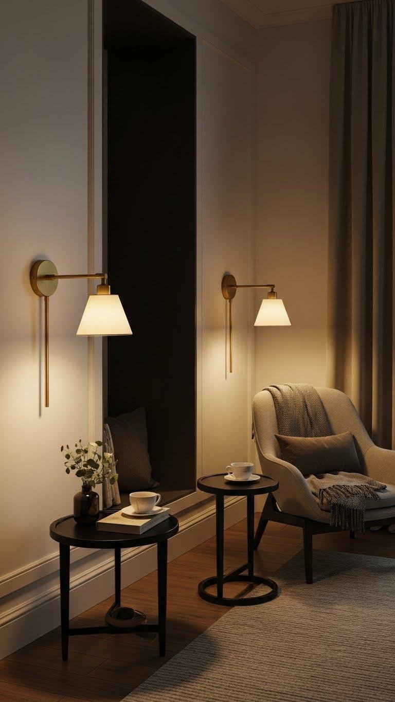 You’ll choose matte brass fixtures with linen shades for a soft, tactile glow. Adjustable arms let you direct light for reading or ambiance, and dimmable bulbs give control over mood.