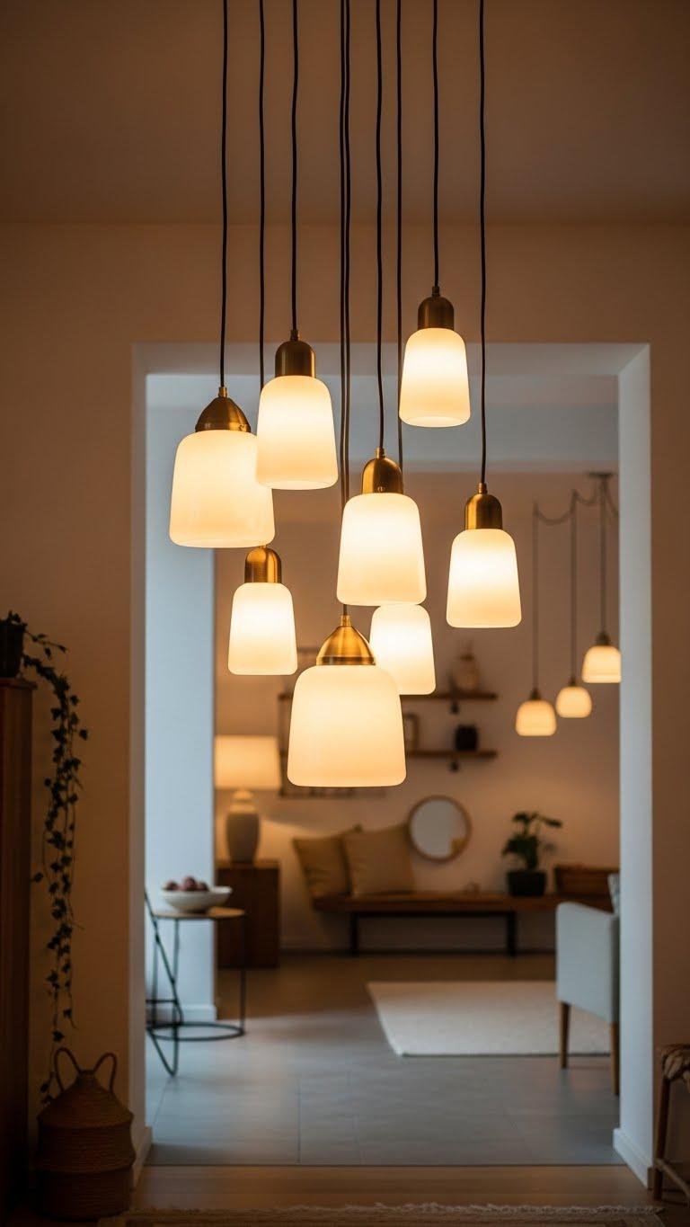 You’ll choose glass diffusers to mute harsh bulbs, vary heights for rhythm, and group lights as ceiling clusters to define zones without walls. This lets you craft airy, liberated spaces that feel curated yet effortless.
