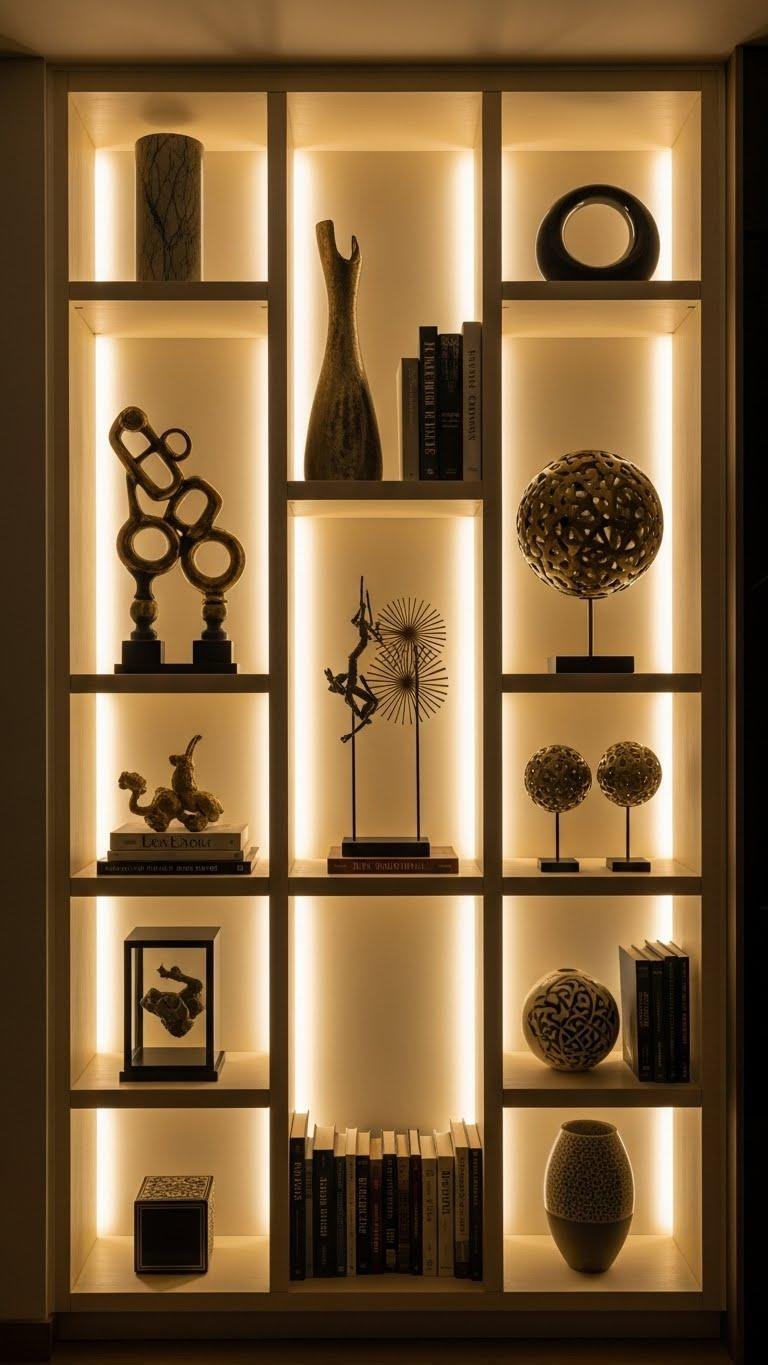 Often overlooked, backlit shelving turns ordinary displays into curated focal points by washing objects in even, flattering light.
