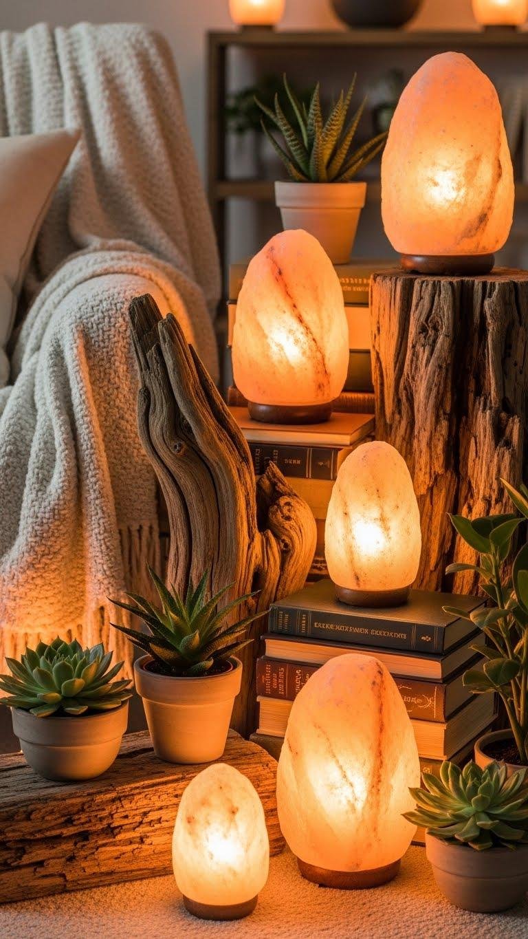 Often overlooked, Himalayan salt lamps make cozy, tactile vignettes that anchor a room without stealing the spotlight.