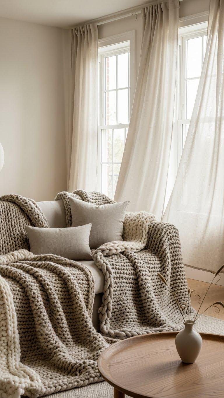 When you layer wool and linen, the room instantly feels tactile and grounded: chunky wool throws add warmth and visual weight, while airy linen cushions and curtains keep the look light and breathable.