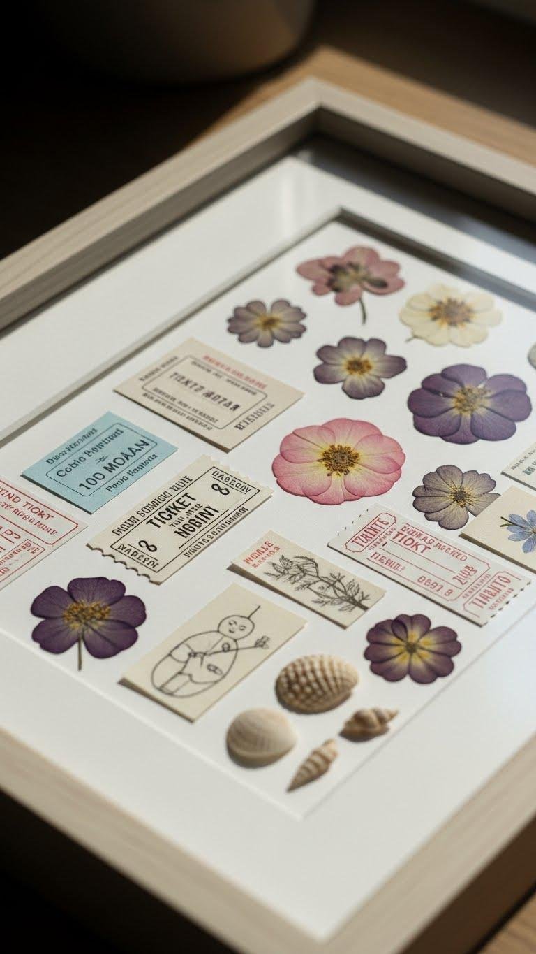 You’ll gather pressed flowers, ticket stubs, tiny sketches, or shells into a framed grouping that reads like a mini story. Position it where light can skim surfaces. This compact curation keeps things deliberate, frees your surfaces, and invites daily, tactile delight.
