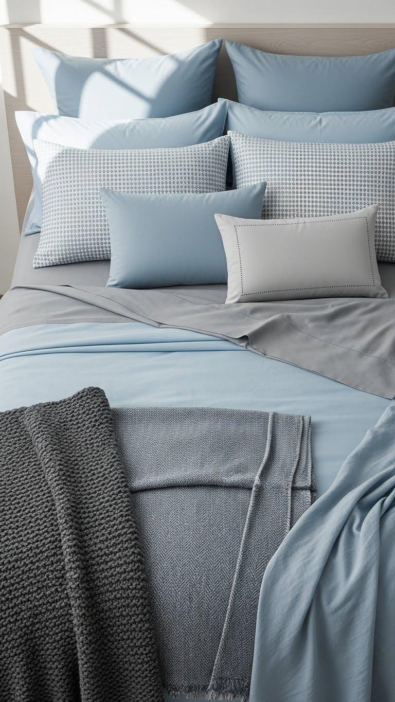 When you build bedding in tones that sit close together on the same color family, the bed looks calm and deliberately put-together without trying too hard.