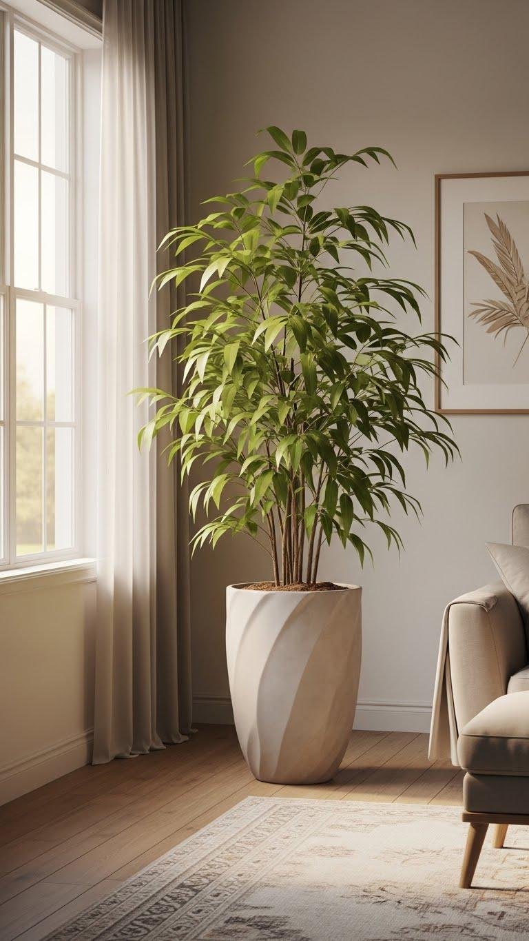 Bring in a single large houseplant to anchor the room and give your minimalist scheme an immediate living focal point. Place it where light and movement meet so leaves whisper in afternoon sun. Choose a low maintenance pot that feels sculptural; you’ll get a dramatic focal point without fuss.