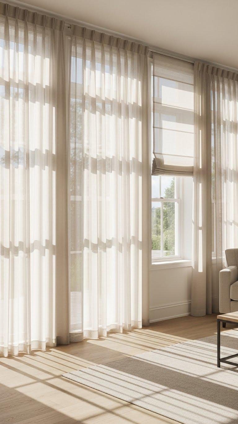 Letting soft sheers filter sunlight will brighten your room while keeping the view gentle and private. You’ll favor layered sheers for variable glow, pairing them with lightweight privacy panels that you can slide open or closed.