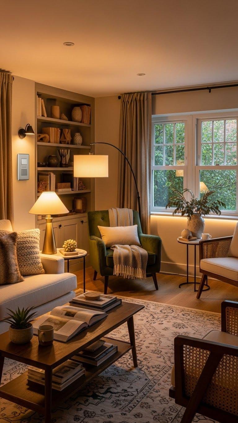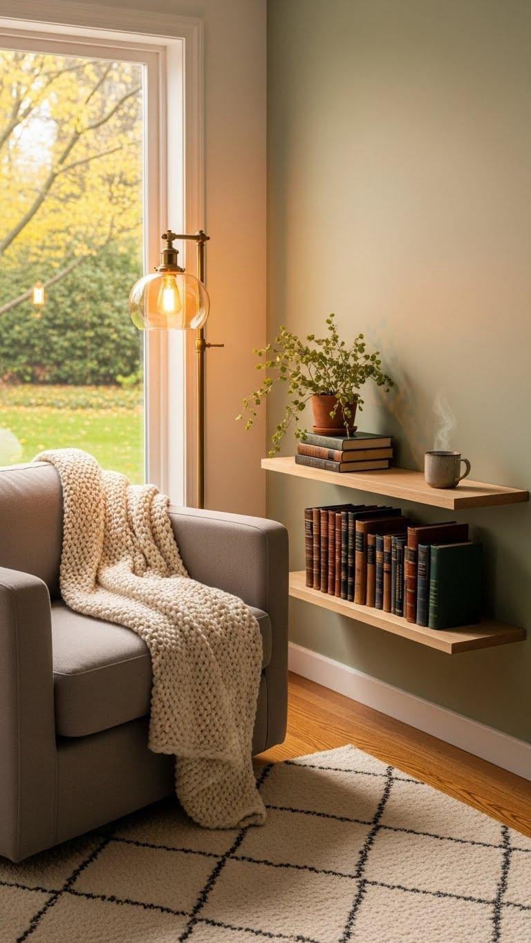 Near a window or in a quiet corner, create a small reading nook that invites you to sit down and stay awhile. Add a comfortable chair, textured throw, and steady task lighting—consider a vintage lamp for warmth.