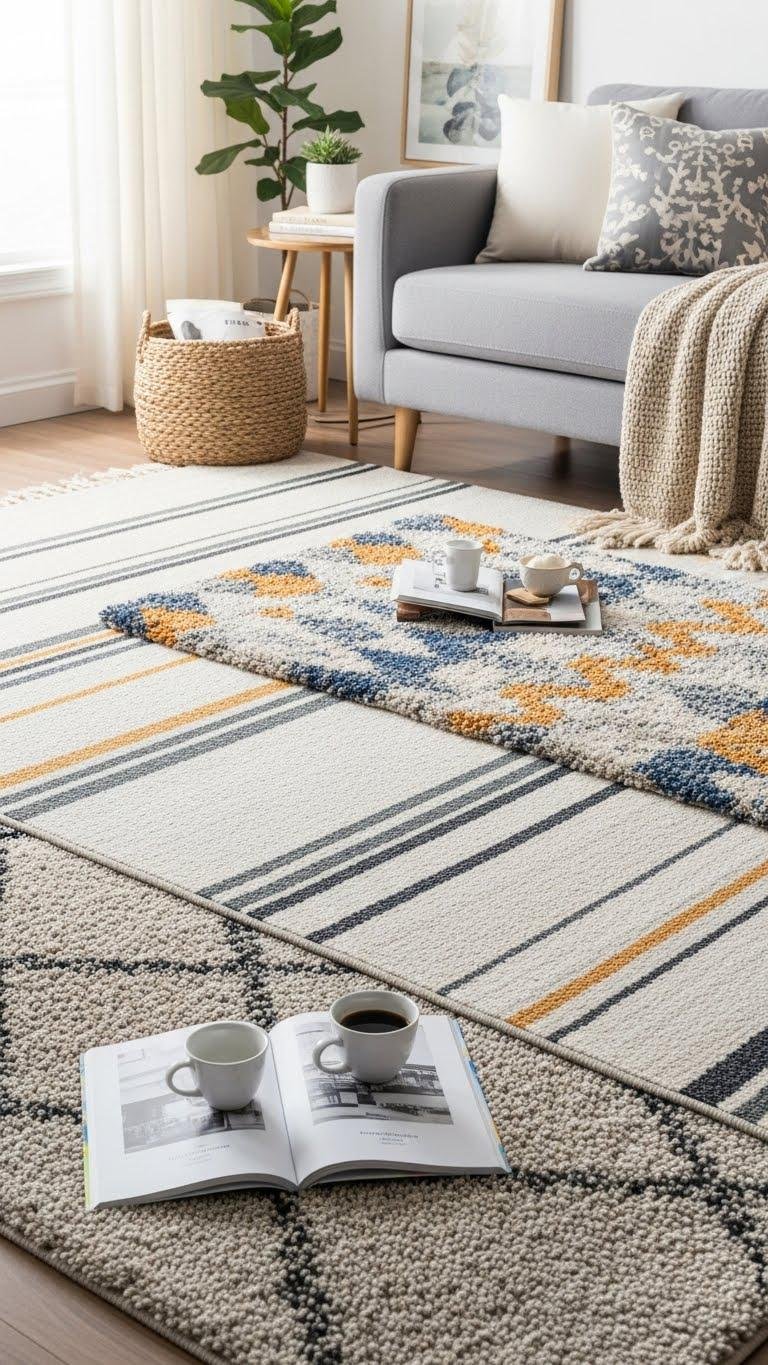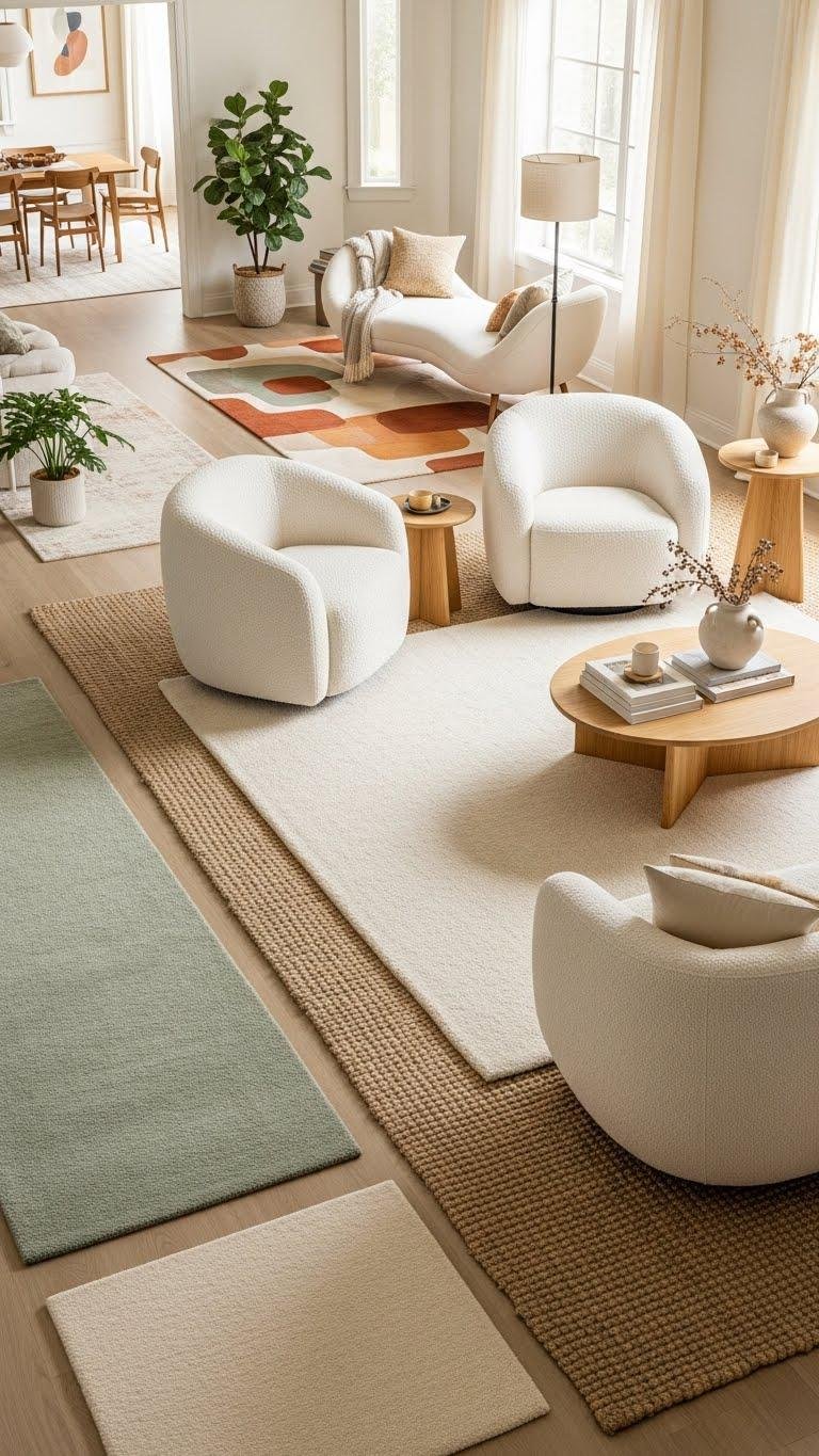 Place rugs so edges meet at walkways, anchor seating, and guide movement. The result feels intentional, open, and free without clutter.