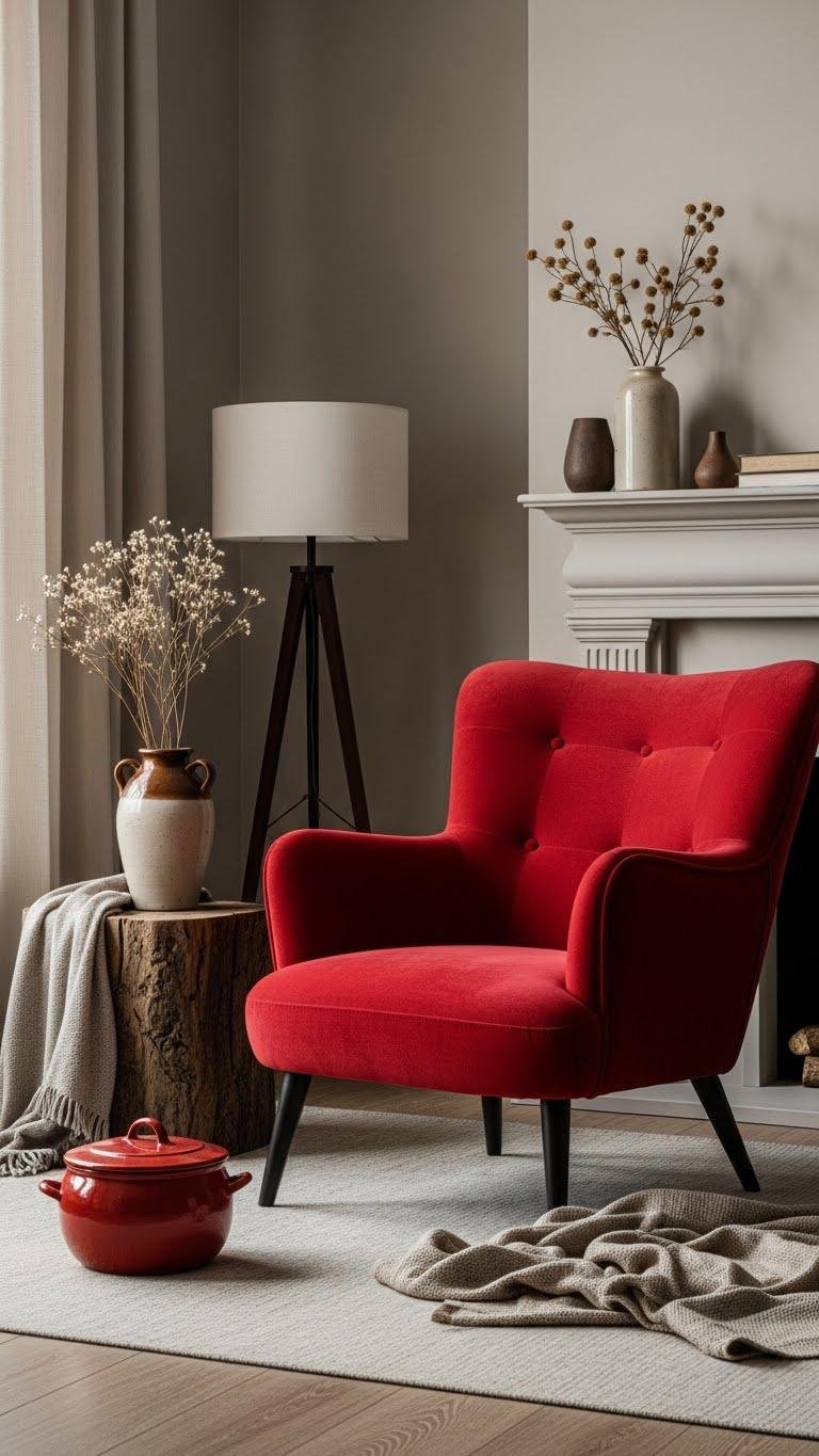 One carefully chosen red accent—think a velvet armchair, a ceramic vase, or a framed print—can lift a neutral space without overwhelming it.