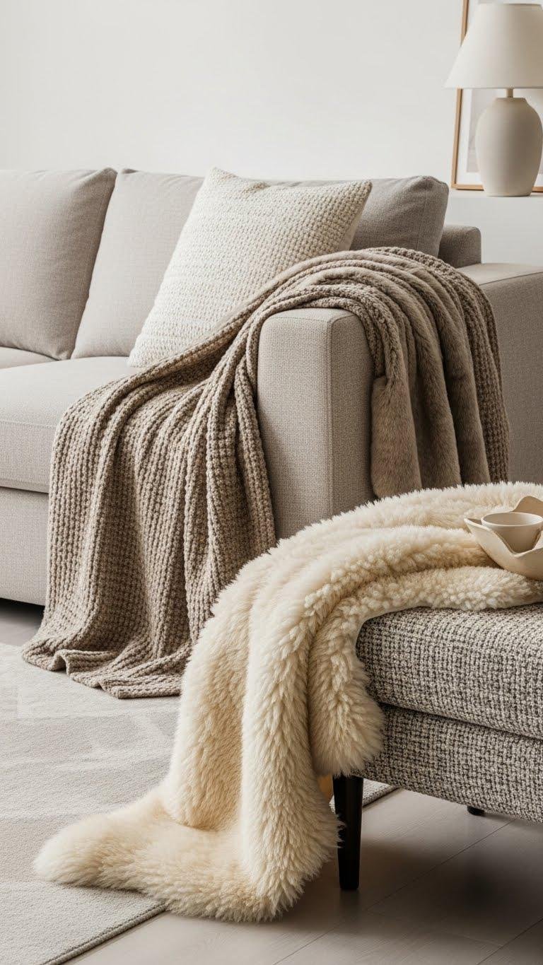 Once your oversized sofa sets the room’s calm tone, add bouclé and faux sheepskin throws to layer texture and warmth without cluttering the look.