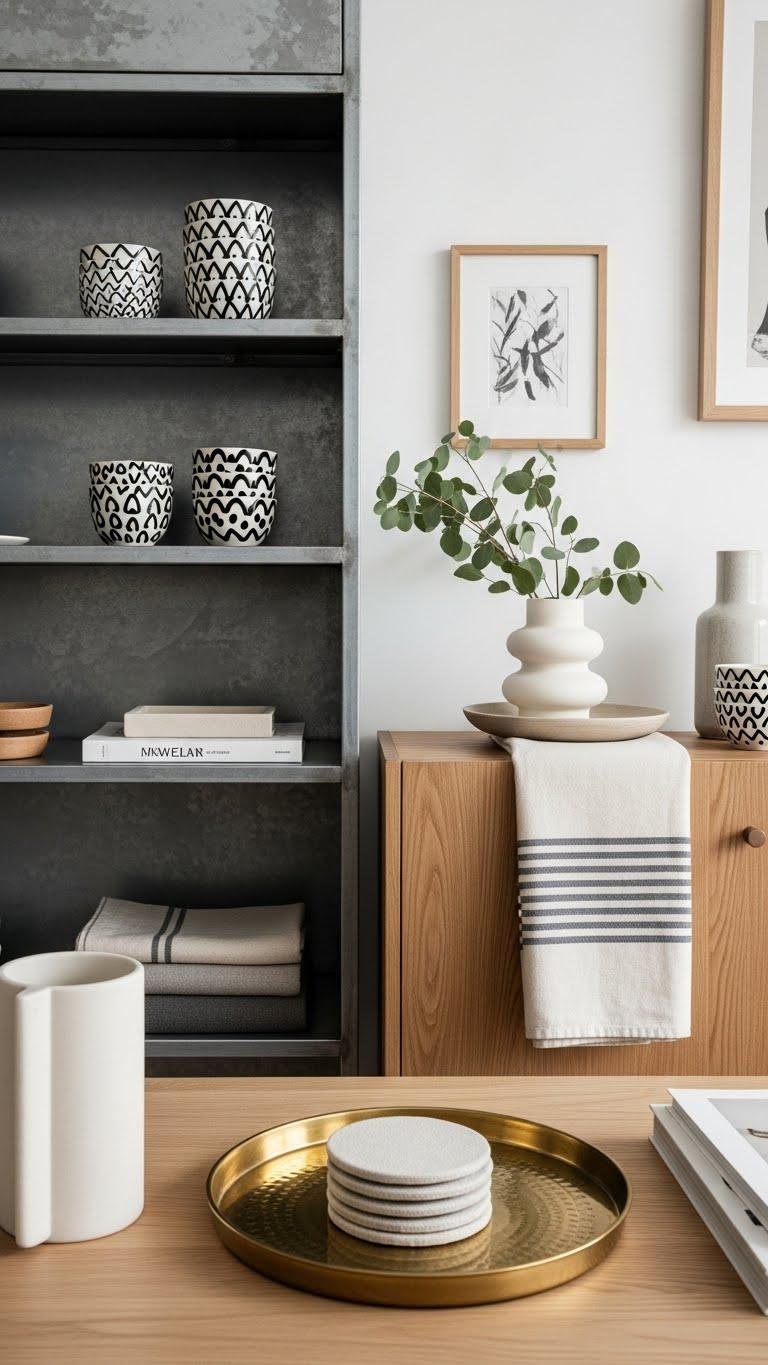 Place patterned ceramics on open shelving, pair a brass tray with linen coasters, and keep pieces few and intentional so each element breathes and supports relaxed, liberated living.