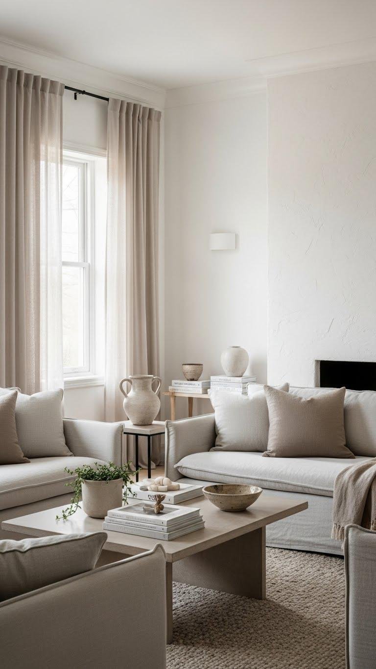 Start with a neutral base palette to give your living room a calm, timeless foundation. You’ll choose soft white walls, layered with linen textures and muted taupe accents to keep visuals light and grounded.