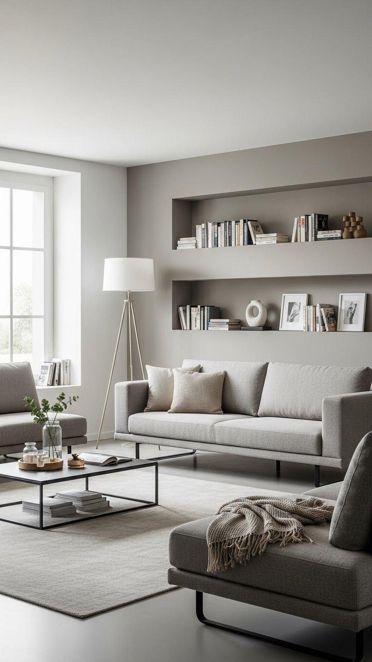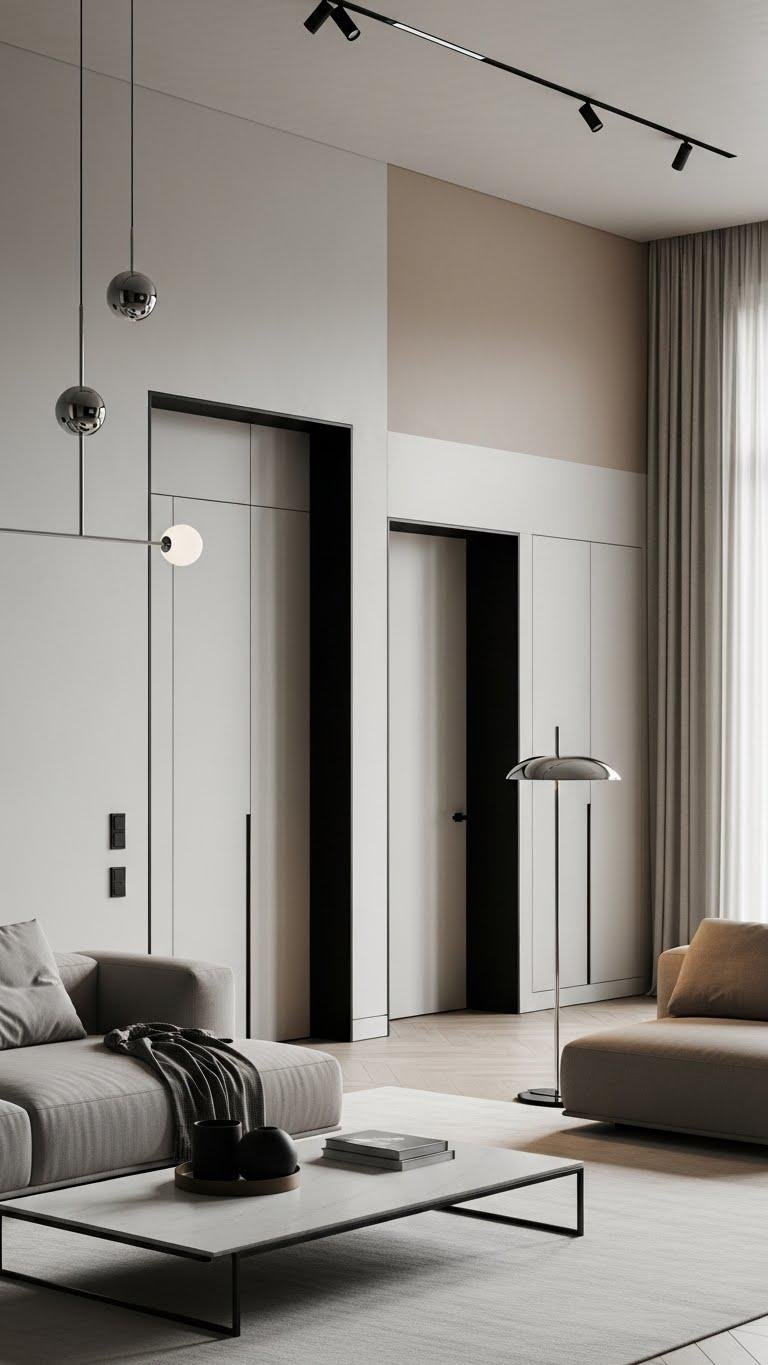 Keep furniture silhouettes minimal, add glossy or brushed accents for shine, and let subtle shifts in shade create calm, airy freedom in your living room.