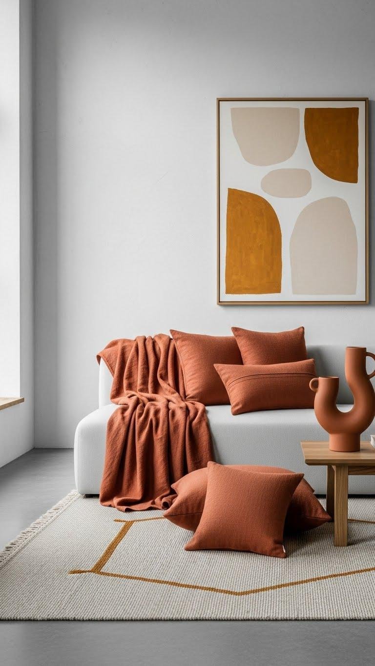 You’ll layer terracotta textiles—throws, cushions, a low rug—and add ochre accents in artwork or a sculptural vase.