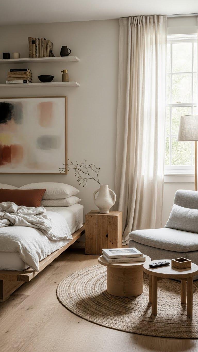 Keep shapes simple, textures organic, and color placements deliberate so the space stays minimal yet inviting, free, and quietly refined.