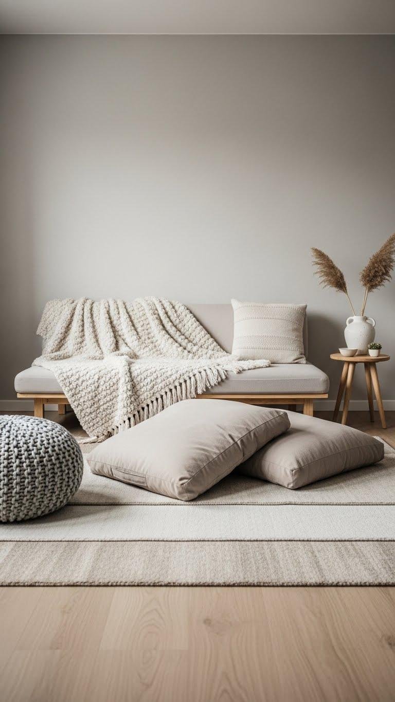 You’ll add texture and warmth with a neutral rug, a couple of plush floor cushions for relaxed lounging, and a chunky knit pouf as a sculptural seat.
