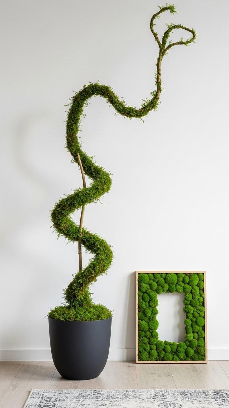 A single, sculptural plant or a statement natural element can anchor your living room and bring biophilic calm without cluttering the space. Choose one standout piece—a sculptural fern, a compact living wall panel, or a framed moss frame—to create a focal point.