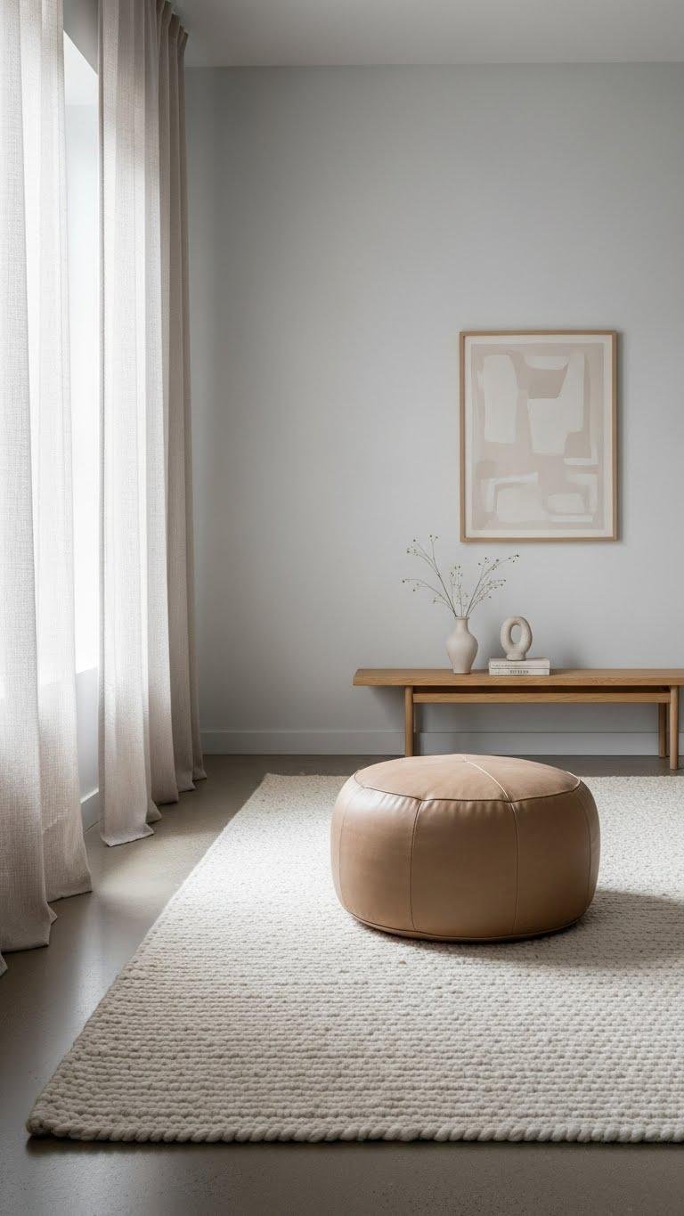 When you skip busy patterns and layer textures instead, the room feels calm and deliberately curated. You’ll create depth with contrast weaves—linen, nubby wool, and a sleek leather pouf—so surfaces speak without shouting.
