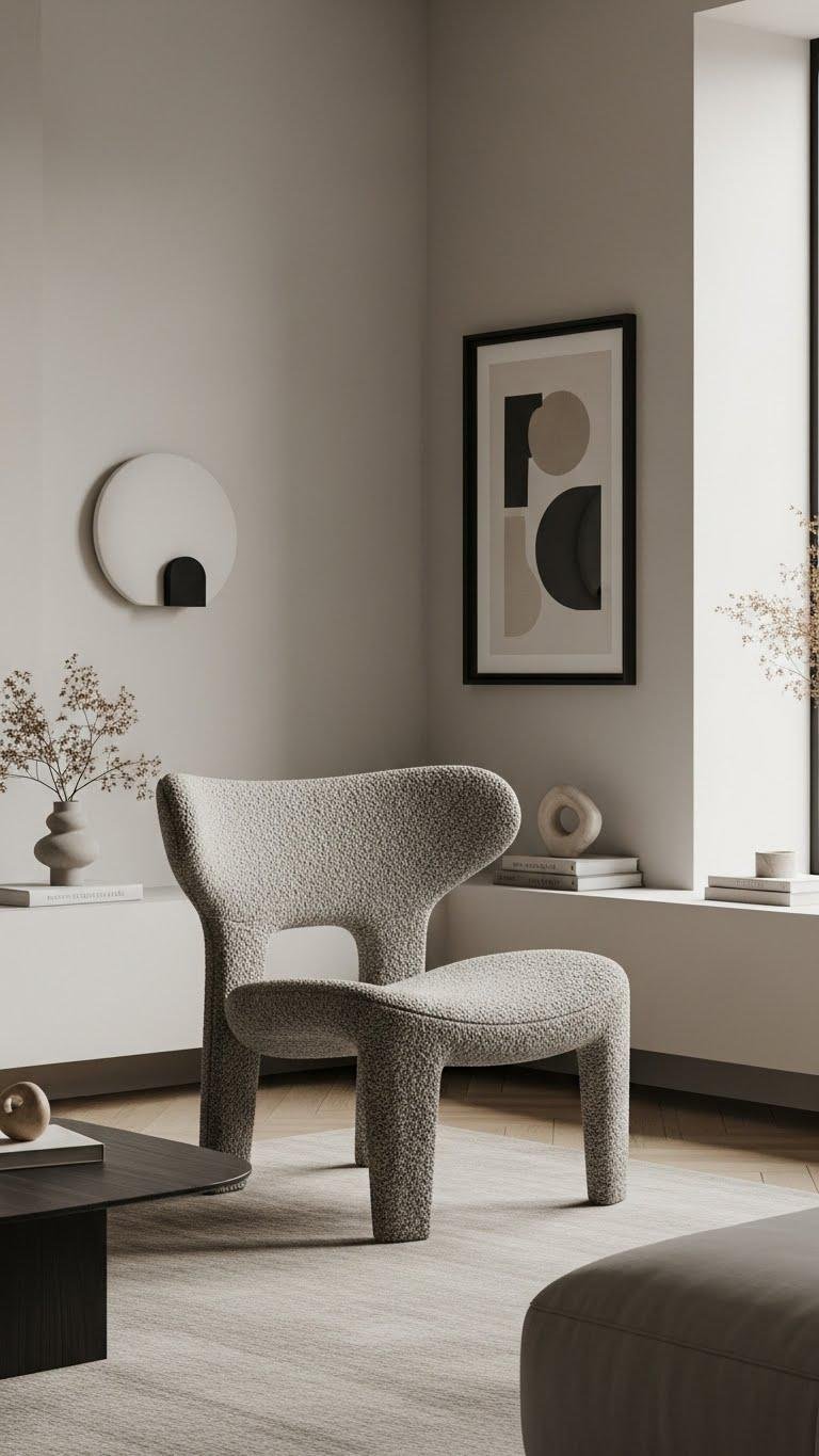 After you’ve layered textures to create a calm, tactile base, introduce a sculptural accent chair to give the room personality and a focal point. Choose a piece with a sculptural silhouette that complements clean lines and adds an unexpected accent texture—think tactile boucle or molded wood.