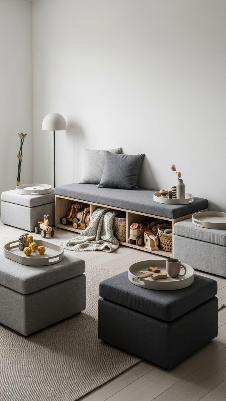 Tuck clutter out of sight with hidden and multifunctional storage that keeps your minimal living room feeling open and purposeful. Choose a concealed bench for tidy toys and blankets, then add modular ottomans that double as seats, trays, or stacked storage.