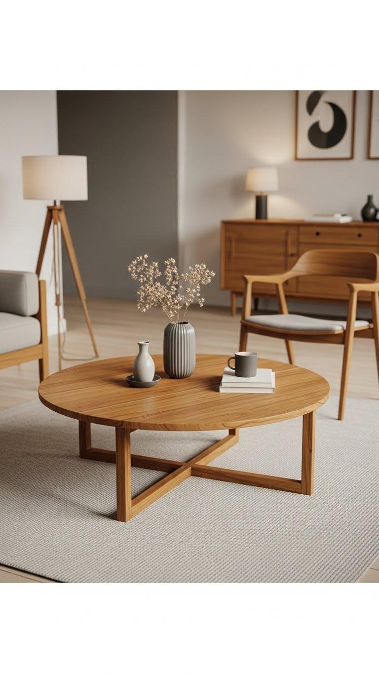 Bring in a round wooden coffee table to soften the room’s geometry and add tactile warmth without disturbing your minimalist lines.