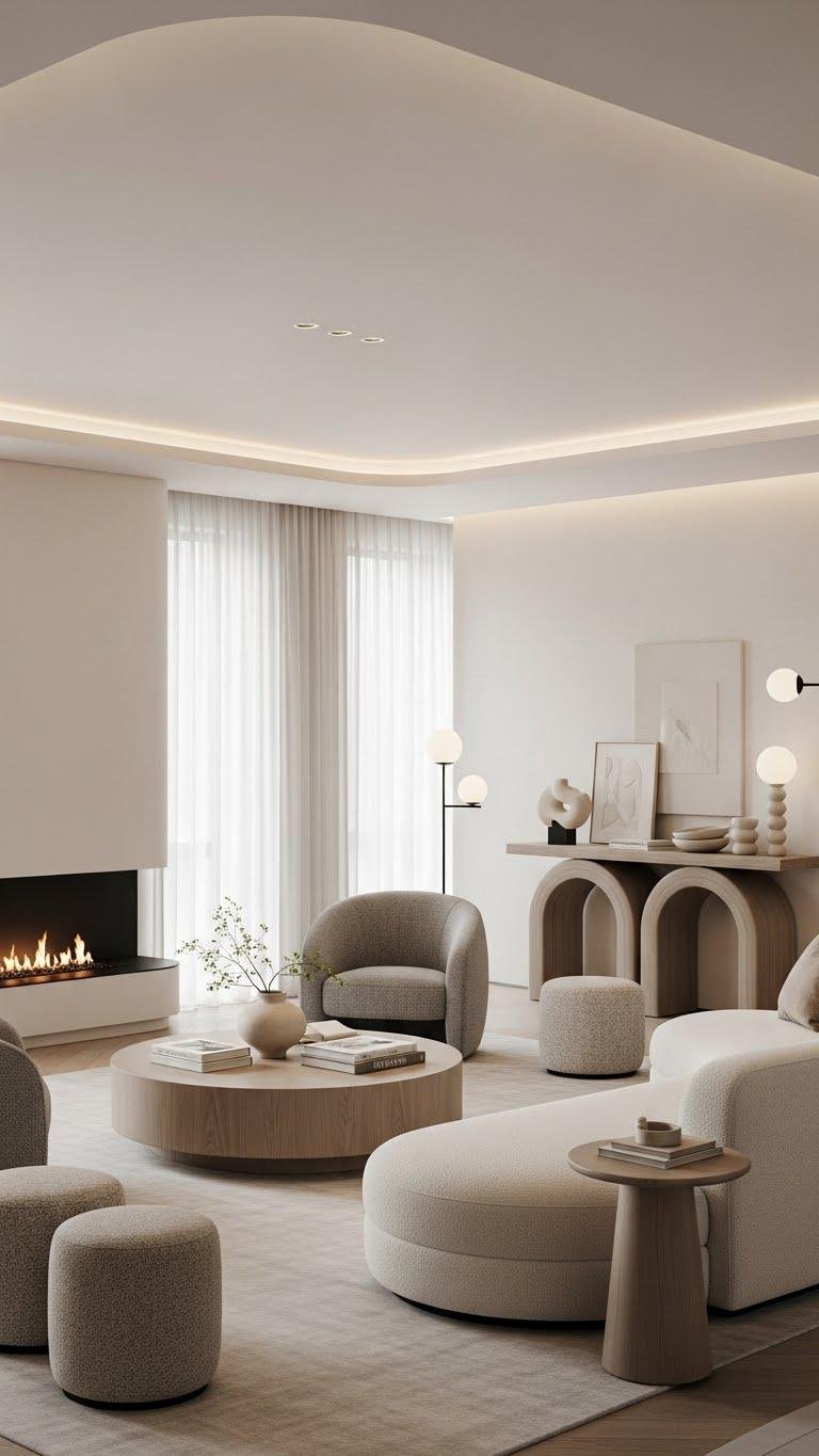 You’ll choose rounded ottomans and an arched console to echo curves, boost comfort, and keep the room airy.
