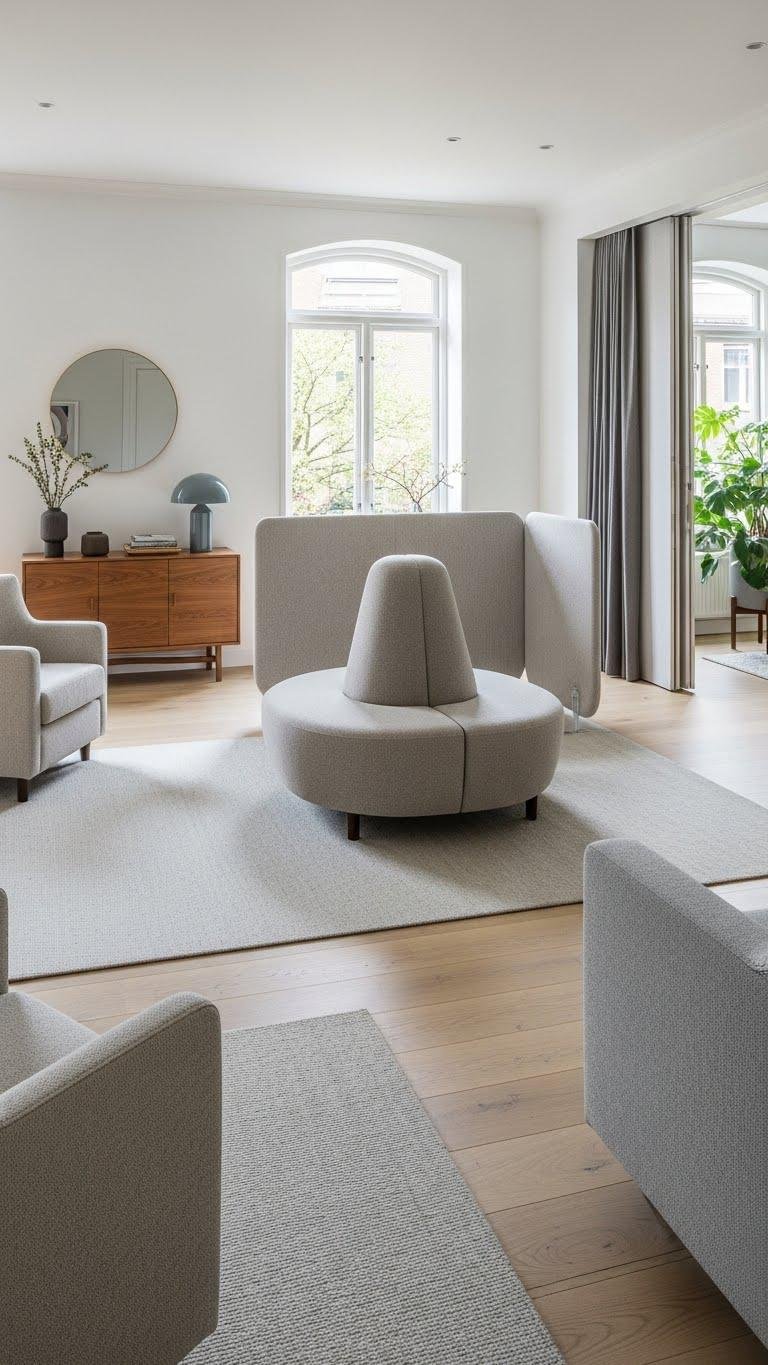 Start with curved furniture to immediately soften hard angles and make your apartment feel more inviting; rounded sofas, arced armchairs, and circular coffee tables create fluid sightlines and better traffic flow.