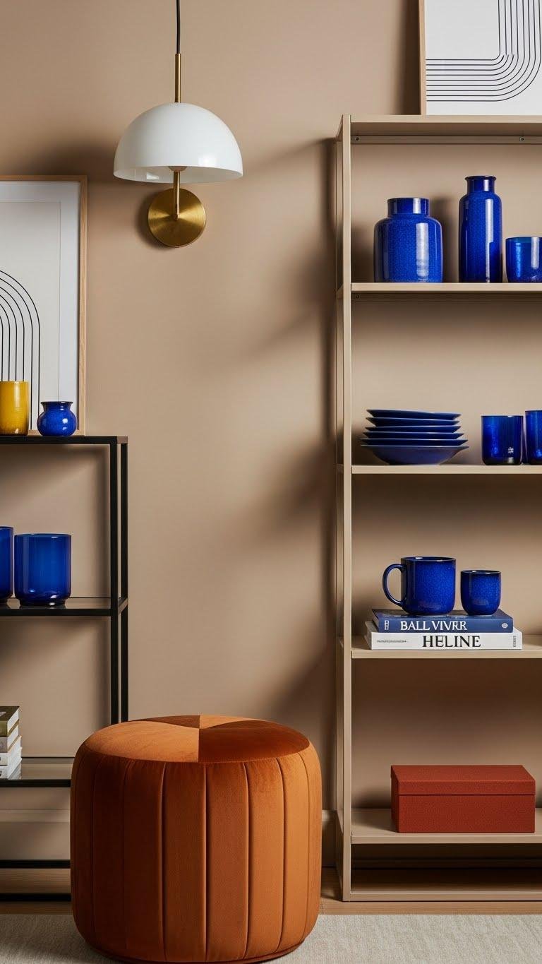 After grounding your space in earthy neutrals, bring energy with jewel-tone accents that feel deliberate, not loud. You’ll choose a velvet pouf for seating and tactile contrast, pair it with sapphire ceramics on open shelving, and keep lines simple.