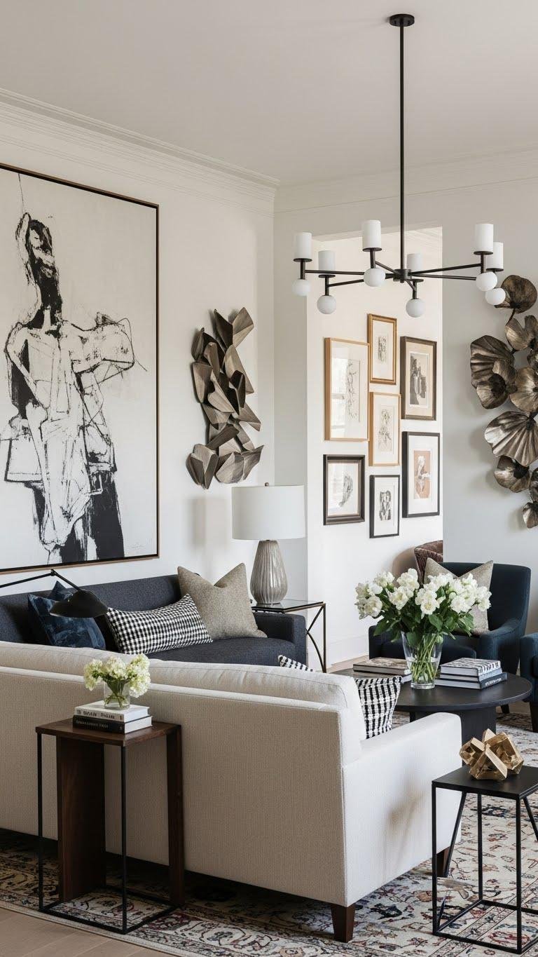 Hang art deliberately, mix textures and finishes, and let walls act like a personal gallery that frees your aesthetic.