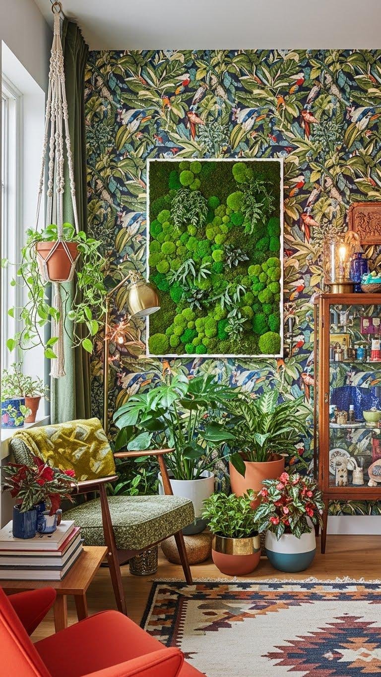 You’ll balance bold patterns and curated objects with breathing room, adding greenery as sculptural punctuation. Choose a lush macramé plant hanger, a vertical moss scape as focal texture, and a few statement pots. You keep personality without chaos, freeing your home to feel bold and calm.