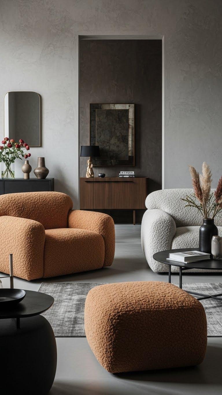 Choose velvet boucle for sculptural pieces, chenille suede for relaxed lounges.