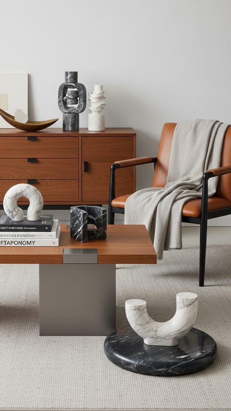 Marry materials boldly: mix warm woods with matte metal, marble with molded plastic, or leather with linen to create pieces that read modern and layered at once.