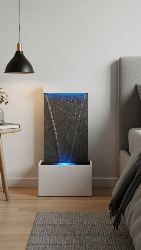 A small tabletop fountain or a sleek wall-mounted water feature can transform your bedroom into a serene retreat by adding gentle, continuous sound that masks noise and soothes the mind.