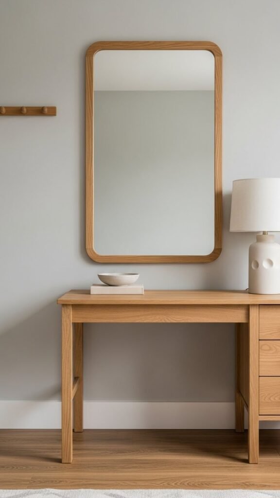 Choose one focal item—a bold artwork or sculptural mirror—to define mood and scale.