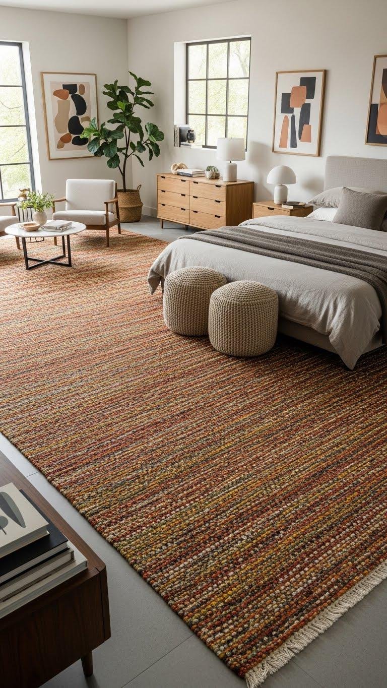 Anchoring the bedroom with an oversized area rug instantly grounds the layout and ties your furniture into a cohesive whole. Choose oversized textures to add warmth and tactile contrast, balancing scale with low-profile furniture.