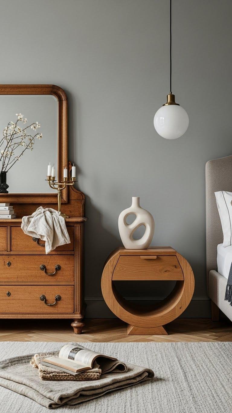 Blend heirloom pieces with bold contemporary forms to create a layered, museum-like bedroom that still feels lived-in. You’ll celebrate patina pairing—soft aged woods, brass, and faded textiles—with striking sculptural contrast like a curvy nightstand or abstract vase.