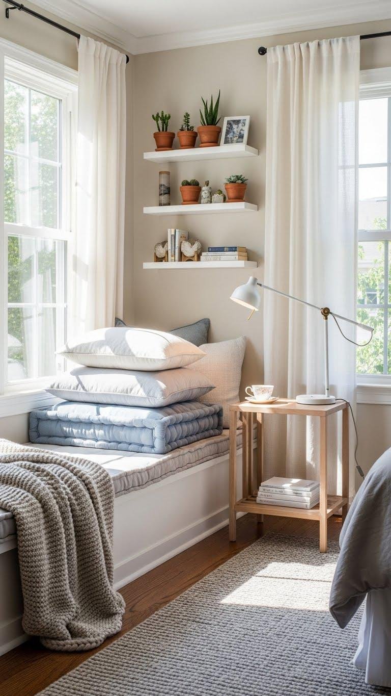 Choose a low-profile window seat layered with cushions, add a slender side table, and mount a focused reading lamp.