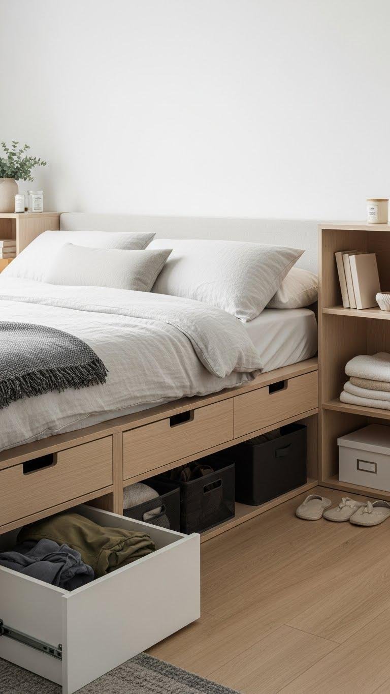 Let the calm of breathable linens extend into smart storage: built-ins and under-bed organization keep that minimalist look uncluttered while maximizing space.