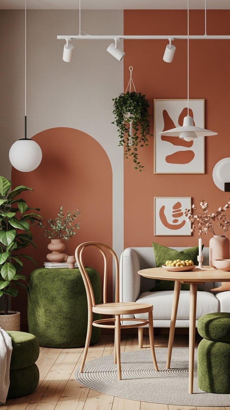 Embrace sunset terracotta as an anchor, pair with linen neutrals and moss greens accents, and balance warm hues with crisp white or matte black fixtures so the space feels open, grounded, and effortlessly free.