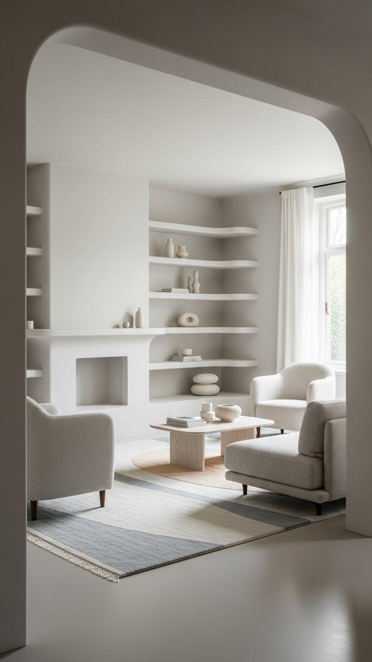 Moving from tactile maximalism to architectural softness, carve out intimate spots with arched alcoves and scalloped edges that frame seating, shelving, or a reading lamp.
